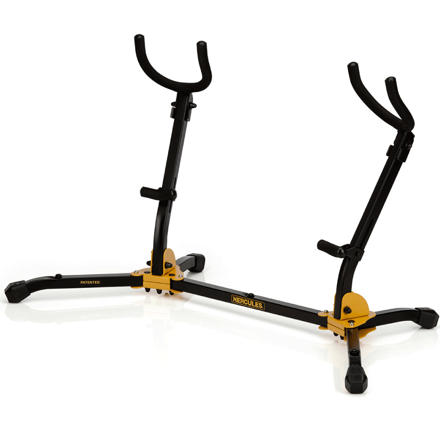 Le support HERCULES DS537B pour saxophone double est conçu pour être plié en une seule pièce avec des goupilles de verrouillage et peut supporter un poids total de l’instrument de 20 kilos.