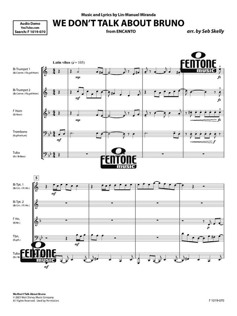 Le tube We Don’t Talk About Bruno, tiré du film d’animation Encanto, a permis à Disney de revenir en tête du Billboard Hot 100 après 29 ans. Il s’agit de l’une des comédies musicales Disney les plus réussies de tous les temps. Réjouissez-vous de cette chanson accrocheuse sur le mystérieux oncle de la famille Madrigal, que Seb Skelly a arrangée au mieux pour quintette de cuivres et qui ne devrait pas manquer à votre prochain concert !